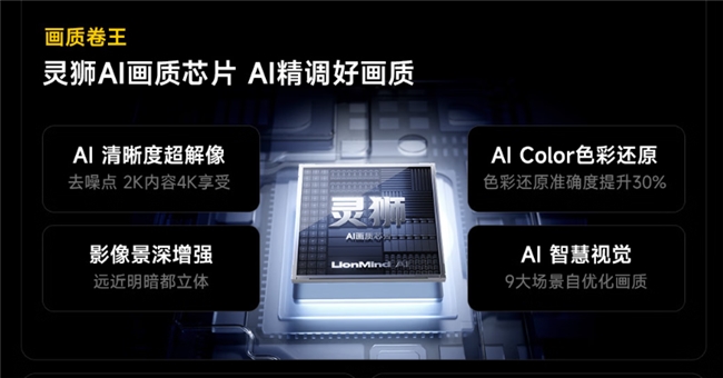 在硬核背光的基礎上,這款電視還搭載同檔最強靈獅AI畫質芯片,依托海信專業調校實力,通過AI清晰度超解像、AI色彩還原、AI人眼景深追焦等核心功能,自動識別電影、追劇、游戲等19種播放場景并實時優化畫質,不僅能讓2K內容呈現4K質感,還能讓人物膚色更自然、畫面立體感拉滿,整體畫質表現不亞于不少萬元高端電視。